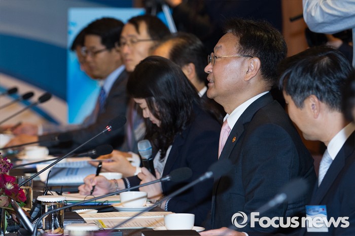 (서울=포커스뉴스) 유일호(오른쪽 두번째) 경제부총리 겸 기획재정부 장관이 27일 오전 서울 중구 신라호텔 영빈관에서 열린 제14차 한중경제장관회의에 참석해 개회사를 하고 있다.