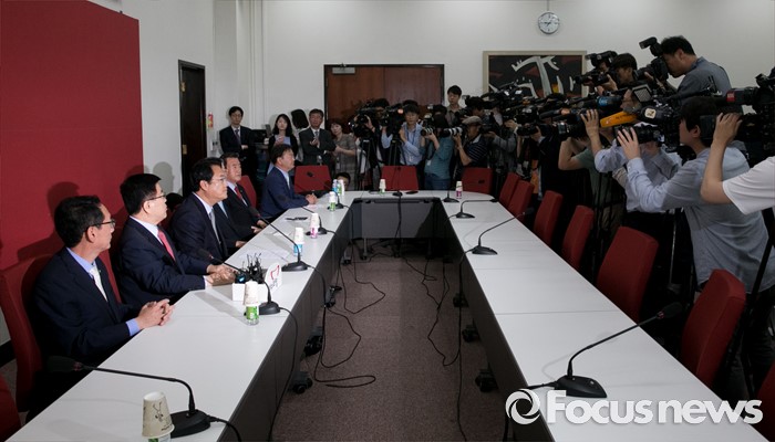 (서울=포커스뉴스) 정진석 새누리당 원내대표와 김희옥 혁신비대위원장 내정자가 27일 오전 서울 여의도 국회에서 원내지도부와 상견례를 하고 있다.
