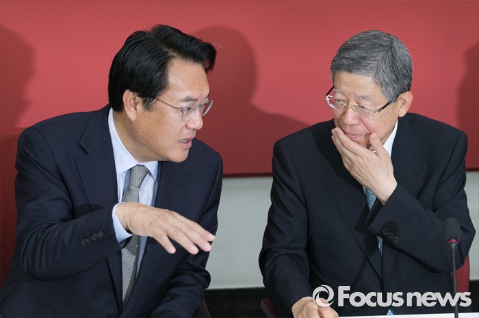 (서울=포커스뉴스) 정진석(왼쪽) 새누리당 원내대표와 김희옥 혁신비대위원장 내정자가 27일 오전 서울 여의도 국회에서 원내지도부와의 상견례 자리에 참석해 대화하고 있다.