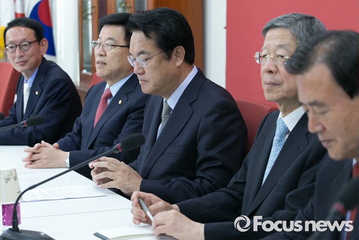(서울=포커스뉴스) 정진석 새누리당 원내대표와 김희옥 혁신비대위원장 내정자가 27일 오전 서울 여의도 국회에서 원내지도부와 상견례를 하고 있다. 왼쪽부터 김도읍 원내수석부대표, 김광림 정책위의장, 정 원내대표, 김 내정자, 홍문표 사무총장 대행, 민경욱 원내대변인.