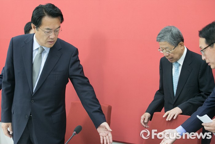 (서울=포커스뉴스) 정진석(왼쪽) 새누리당 원내대표와 김희옥(오른쪽 두번째) 혁신비대위원장 내정자가 27일 오전 서울 여의도 국회에서 원내지도부와의 상견례 자리에 참석하고 있다.