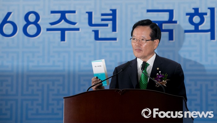 (서울=포커스뉴스) 27일 오전 서울 여의도 국회에서 열린 68주년 국회 개원 기념식에 참석한 정의화 국회의장이 기념사를 통해 정부가 상시 청문회법 등이 포함된 국회법 개정안 재의 요구안을 의결한 것과 관련 헌법 및 국회관계법 책을 들고 입장을 전하고 있다.