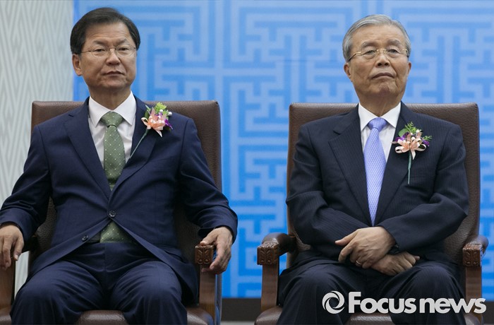(서울=포커스뉴스) 27일 오전 서울 여의도 국회에서 열린 68주년 국회 개원 기념식에 참석한 김종인(오른쪽) 더불어민주당 비대위 대표와 천정배 국민의당 공동대표가 자리하고 있다.