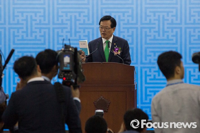 (서울=포커스뉴스) 정의화 국회의장이 27일 오전 서울 여의도 국회에서 열린 '제68주년 국회 개원 기념식'에 참석해 인사말을 하던 중 헌법-국회관계법 책을 손에 들고 국회법 개정안에 대해 대통령의 거부권 행사에 대한 입장을 전달하고 있다.
