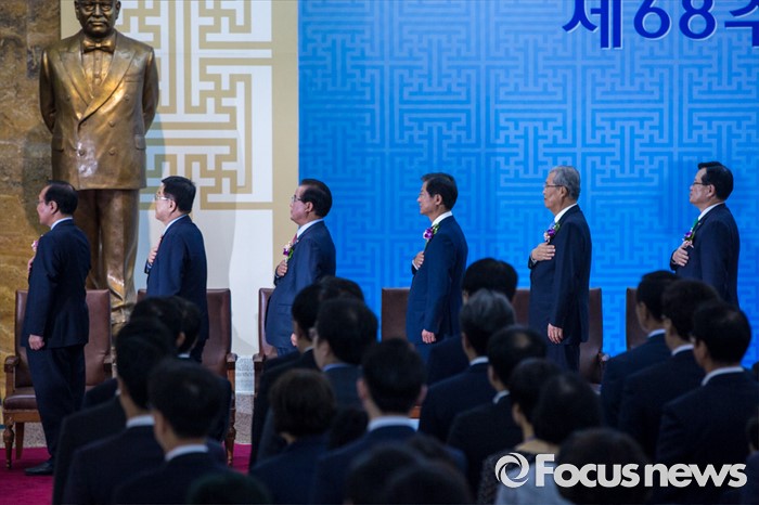 (서울=포커스뉴스) 정의화(오른쪽) 국회의장을 비롯한 여야 대표 및 여야지도부가 27일 오전 서울 여의도 국회에서 열린 '제68주년 국회 개원 기념식'에 참석해 국민의례 하고 있다. 이날 정진석 새누리당 원내대표는 행사에 참석하지 않았다.