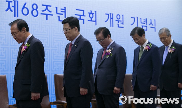 (서울=포커스뉴스) 27일 오전 서울 여의도 국회에서 열린 68주년 국회 개원 기념식에 참석한 노회찬(왼쪽부터) 정의당 원내대표, 김광림 새누리당 정책위의장, 정갑윤 국회 부의장, 천정배 국민의당 공동대표, 김종인 더불어민주당 비대위 대표 등 참석자들이 묵념을 하고 있다.