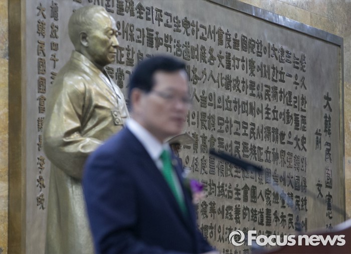 (서울=포커스뉴스) 27일 오전 서울 여의도 국회에서 열린 68주년 국회 개원 기념식에 참석한 정의화 국회의장이 정부가 상시 청문회법 등이 포함된 국회법 개정안 재의 요구안을 의결한 것과 관련 입장을 전하고 있는 모습 뒤로 제헌헌법 전문 조형물이 보이고 있다.