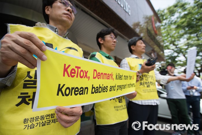 (서울=포커스뉴스) 환경보건시민센터 관계자들이 27일 오전 서울 용산구 주한 덴마크대사관 앞에서 가습기살균제 사건 관련 덴마크 정부 행동 촉구 항의서한 전달 기자회견을 하고 있다.