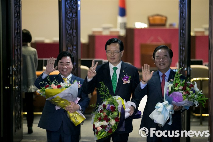 (서울=포커스뉴스) 27일 오전 서울 여의도 국회에서 68주년 국회 개원 기념식을 마친 정의화(가운데) 국회의장이 본회의장에서 정갑윤(오른쪽), 이석현 국회 부의장 등 직원들과 함께 기념촬영 후 나서며 취재진을 향해 포즈를 취하고 있다.