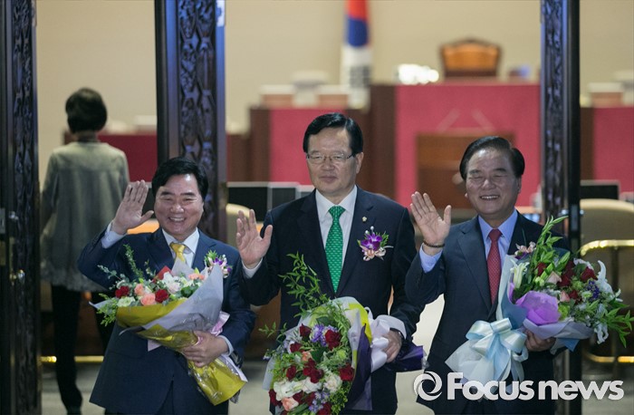 (서울=포커스뉴스) 27일 오전 서울 여의도 국회에서 68주년 국회 개원 기념식을 마친 정의화(가운데) 국회의장이 본회의장에서 정갑윤(오른쪽), 이석현 국회 부의장 등 직원들과 함께 기념촬영 후 나서며 취재진을 향해 포즈를 취하고 있다.
