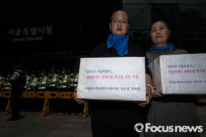 (서울=포커스뉴스)27일 오전 서울 중구 서울시청 앞에서 전국 장애인 부모연대와 서울특수학교학부모협의회 회원들의 발달장애인 정책 수립을 촉구하는 삭발식이 끝난 뒤 참가자들이 박원순 시장에게 전달하기 위해머리카락이 담긴 박스를 들고 있다.