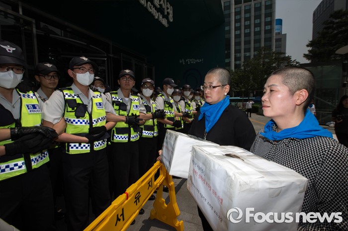 (서울=포커스뉴스)27일 오전 서울 중구 서울시청 앞에서 전국 장애인 부모연대와 서울특수학교학부모협의회 회원들의 발달장애인 정책 수립을 촉구하는 삭발식이 끝난 뒤 참가자들이 박원순 시장에게 전달하기 위해머리카락이 담긴 박스를 들고 있다.