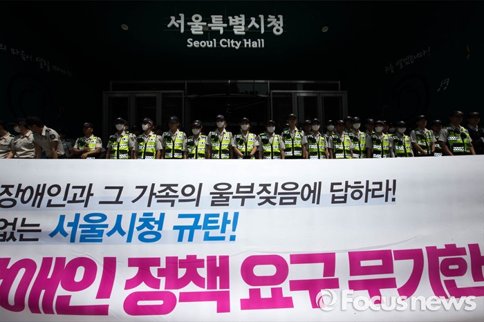 (서울=포커스뉴스)27일 오전 서울 중구 서울시청 앞에서 전국 장애인 부모연대와 서울특수학교학부모협의회 회원들이 발달장애인 정책 수립을 촉구하는 삭발식이 열리고 있다.
