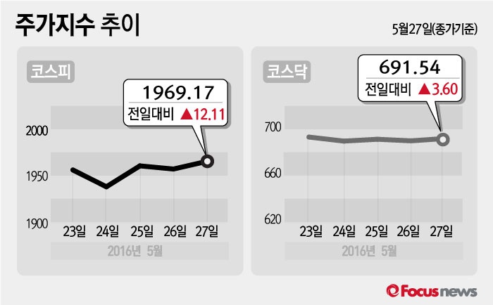 (서울=포커스뉴스) 27일 코스피지수는 전날 보다 0.62%(12.11포인트) 오른 1,969.17에 장을 마쳤다. 코스닥지수는 전일 대비 0.52%(3.60포인트) 오른 691.54에 마감했다.