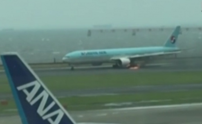 (서울=포커스뉴스) 27일 오후 일본 도쿄 하네다 공항에서 이륙을 준비하던 대한항공 항공기의 왼쪽 날개 부근에서 화재가 발생하고 있다. 사고기는 도쿄에서 서울로 가는 대한항공 2708편으로, 승객과 승무원 319명은 모두 무사한 것으로 알려졌다.<사진=NHK 화면캡쳐>