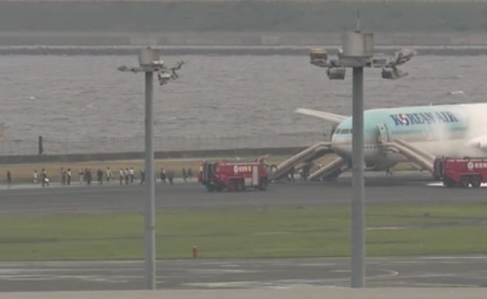 (서울=포커스뉴스) 27일 오후 일본 도쿄 하네다 공항에서 이륙을 준비하던 대한항공 항공기의 왼쪽 날개 부근에서 화재가 발생해, 승객과 승무원들이 비행기를 탈출, 긴급 대피하고 있다. 사고기는 도쿄에서 서울로 가는 대한항공 2708편으로, 승객과 승무원 319명은 모두 무사한 것으로 알려졌다.<사진=NHK 화면캡쳐>