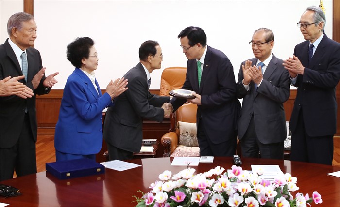 (서울=포커스뉴스) 정의화(오른쪽 세번째) 국회의장이 27일 오전 서울 여의도 국회 의장집무실에서 '대한민국 제헌국회의원 유족회'로부터 감사패를 전달받고 있다. 유족회는 "제헌회관을 개보수하고, '대한민국 제헌국회의원 기념관'으로 설립 및 발족하는데 정 의장께서 각별한 노력과 성심을 기울여주신 것에 대해 감사하는 마음을 담아 감사패를 드린다"고 전했다. <사진제공=국회>