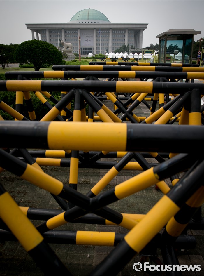 (서울=포커스뉴스) 정부가 상시 청문회 등의 내용이 포함된 국회법 개정안에 대해 거부권을 행사해 여야가 입장 차이를 보이고 있는 27일 오후 서울 여의도 국회 정문 바리케이트 너머로 본청이 보이고 있다.