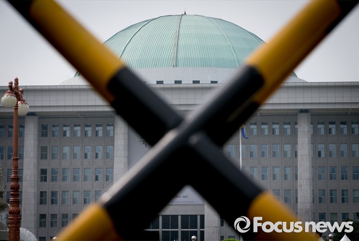 (서울=포커스뉴스) 정부가 상시 청문회 등의 내용이 포함된 국회법 개정안에 대해 거부권을 행사해 여야가 입장 차이를 보이고 있는 27일 오후 서울 여의도 국회 정문 바리케이트 너머로 본청이 보이고 있다.
