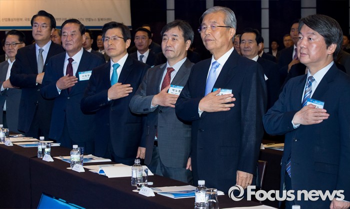 (서울=포커스뉴스) 27일 오후 서울 웨스틴 조선호텔에서 열린 2016 한반도통일 심포지엄에 참석한 황교안 국무총리, 정진석 새누리당 원내대표, 김종인 더불어민주당 비대위 대표, 안철수 국민의당 상임공동대표 등 내빈들이 국기에 대한 경례를 하고 있다.
