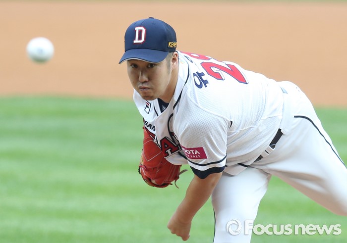 (서울=포커스뉴스) 27일 서울 잠실구장에서 열린 2016프로야구 LG-두산 경기에서 1회초 두산 선발투수 유희관이 투구하고 있다.
