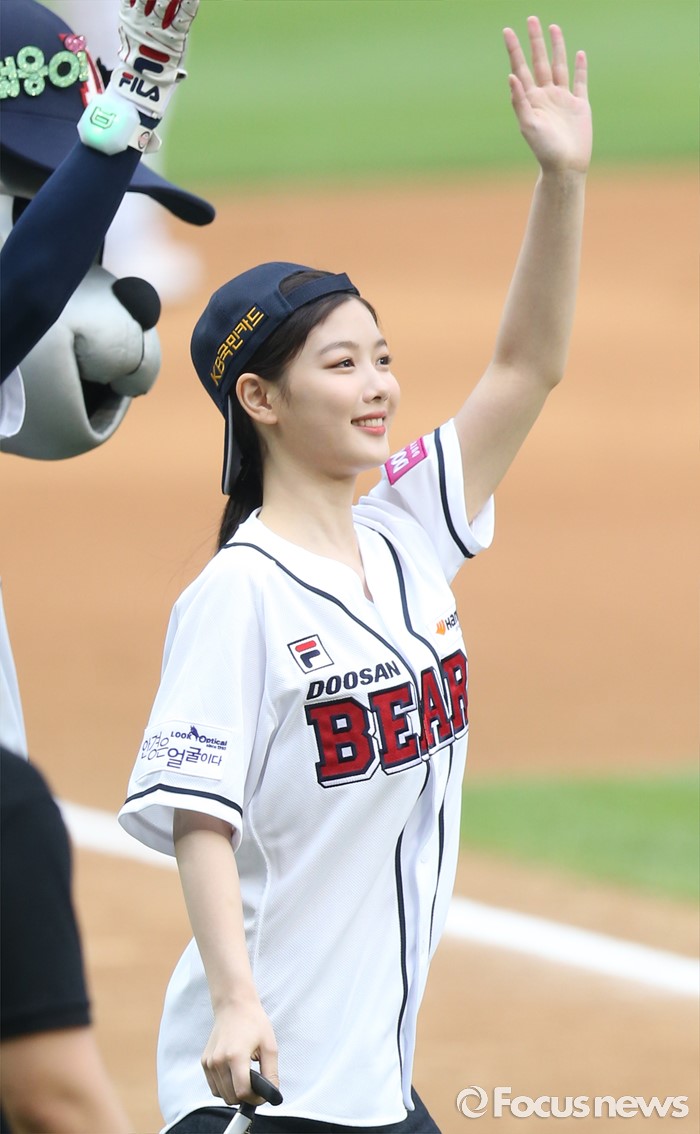 (서울=포커스뉴스) 27일 서울 잠실구장에서 열린 2016 프로야구 LG-두산 경기에 앞서 배우 김유정이 시구하기 위해 입장하며 관중에게 손을 흔들며 인사하고 있다.
