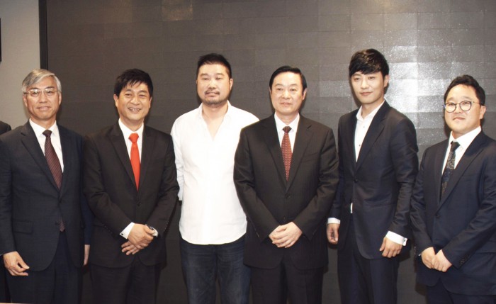 이날 회의는 중국 정부 요청으로 이뤄졌다. 중국 측에서는 류치바오 중국 중앙선전부장을 비롯한 정부 관계자, 중국 화책미디어 관계자 등이 참석했다. 우리 측에서는 '태양의 후예' 제작진인 김원석 작가·한석원 PD, 김우택 NEW 총괄대표, 이의춘 문화체육관광부 차관보, 송성각 한국콘텐츠진흥원장, 배우 진구 등이 자리했다.왼쪽부터 추궈홍 주한중국대사, 김우택 NEW 총괄대표, 김원석 작가, 류치바오 중국 중앙선전부 부장, 배우 진구, 장경익 NEW 영화사업부 대표 등이 27일 한중문화교류회의에서 기념사진을 찍었다. <사진제공=NEW>