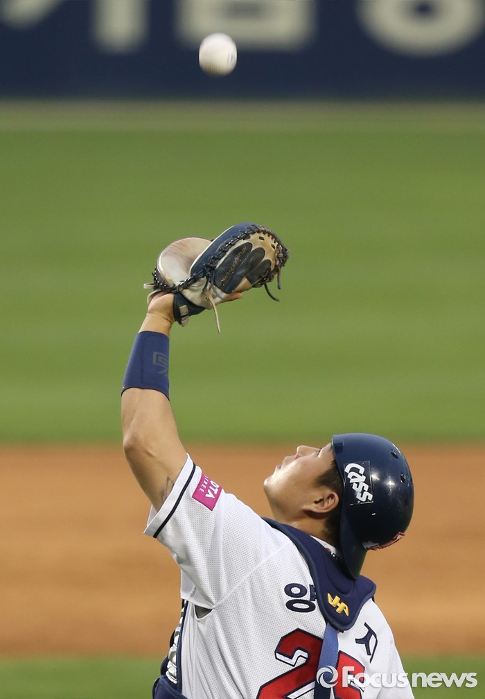 (서울=포커스뉴스) 27일 서울 잠실구장에서 열린 2016프로야구 LG-두산 경기 2회초 2사후 두산 포수 양의지가 LG 유강남의 내야 플라이를 잡고 있다.