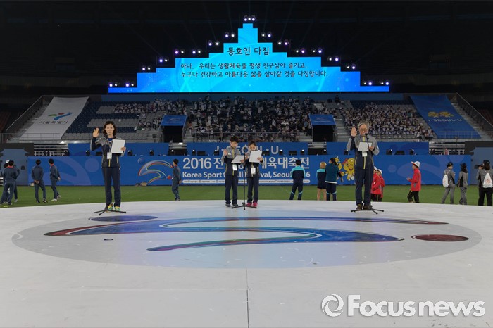 (서울=포커스뉴스) 2016 전국생활체육대축전 개막식이 열린 27일 오후 서울 송파구 잠실 올림픽주경기장에서 생활체육 동호인들이 선서를 하고 있다.