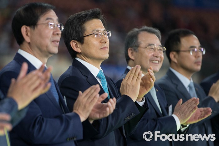 (서울=포커스뉴스) 2016 전국생활체육대축전 개막식이 열린 27일 오후 서울 송파구 잠실 올림픽주경기장에서 내빈들이 박수치고 있다. 왼쪽부터 박원순 서울시장, 황교안 국무총리, 강영중 대한체육회장.