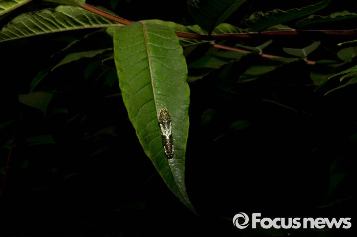 (서울=포커스뉴스) 28일 오전 나비 특별 체험전이 열리고 있는 서울 성동구 서울숲 나비정원에 나비 애벌레가 나뭇잎에 매달려 있다.