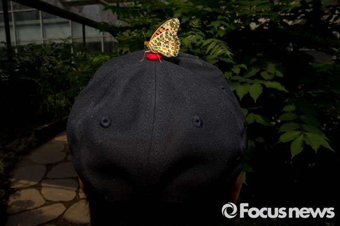 (서울=포커스뉴스) 28일 오전 나비 특별 체험전이 열리고 있는 서울 성동구 서울숲 나비정원에서 나비 한마리가 관람객의 모자 위에 앉아 있다.
