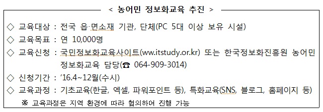 송정수 미래부 정보보호정책관은 “이번 농어업인 정보화교육이 계층간 정보격차 해소 및 사회 통합에 기여하기를 기대하며 관련 부처‧기관간의 협력을 강화하여 지속적으로 확대‧추진해 나가겠다”고 밝혔다.농어민 정보화교육 내용.<표제공=미래부>