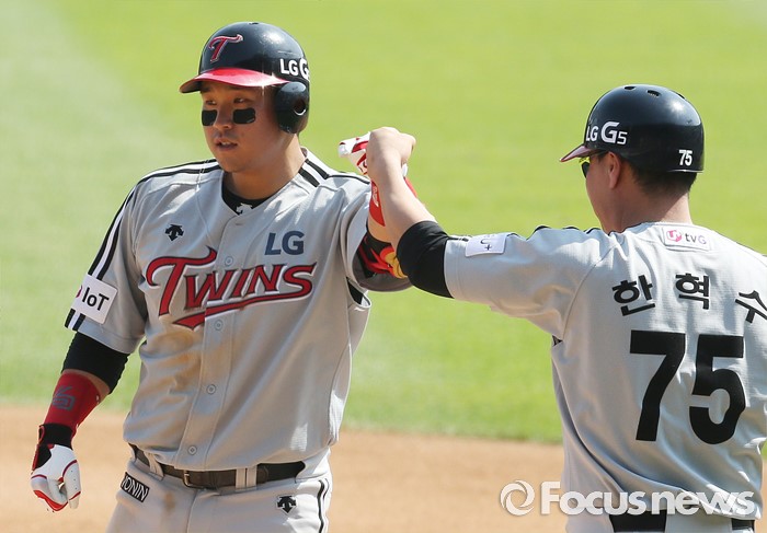 (서울=포커스뉴스) 29일 서울 잠실구장에서 열린 2016프로야구 LG-두산 경기 3회초 2사 만루에서 LG 유강남이 2타점 역전 안타를 치고 한혁수 코치의 축하를 받고 있다.