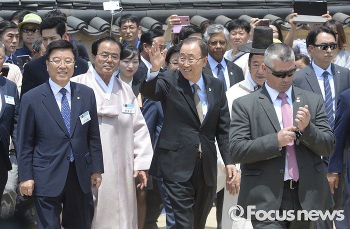 (안동=포커스뉴스) 29일 오후 경북 안동 하회마을을 방문한 반기문 유엔 사무총장이 식수를 위해 이동하며 시민들을 향해 손을 흔들고 있다.
