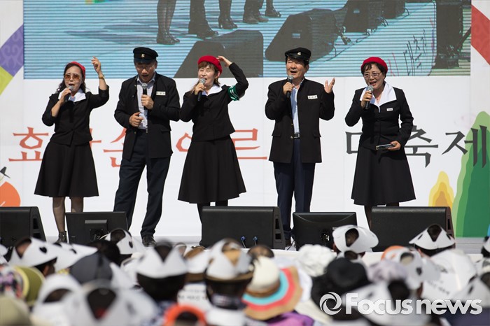 (서울=포커스뉴스) 정세균(오른쪽 두번쨰) 더불어민주당 의원과 김영종(왼쪽 두번째) 종로구청장을 비롯한 참석자들이 29일 오후 서울 종로구 교동초등학교에서 열린 '2016 효자손 어르신 대축제'에 참석해 옛 고등학교 교복과 모자를 쓰고 노래를 부르고 있다.