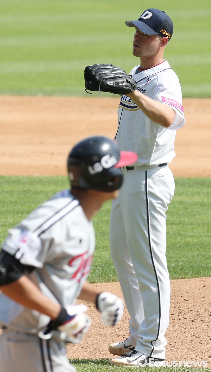 (서울=포커스뉴스) 29일 서울 잠실구장에서 열린 2016프로야구 LG-두산 경기 3회초 2사 1,3루에서 두산 보우덴이 LG 김용의를 볼넷으로 진루시키고 있다.