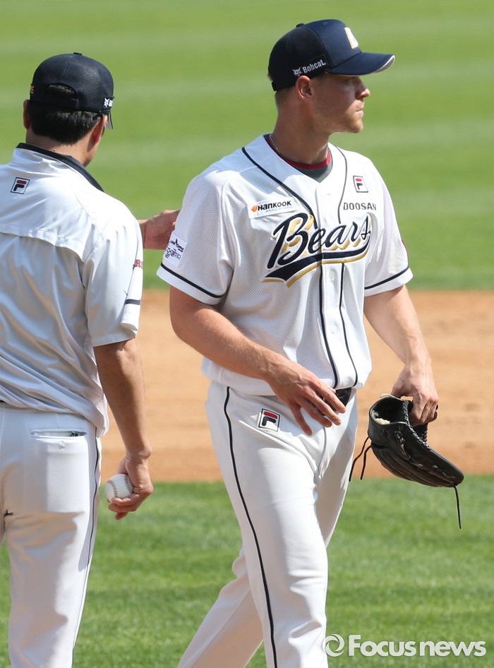 (서울=포커스뉴스) 29일 서울 잠실구장에서 열린 2016프로야구 LG-두산 경기 3회초 2사 1루에서 7실점한 두산 투수 보우덴이 교체돼 마운드에서 내려오고 있다.