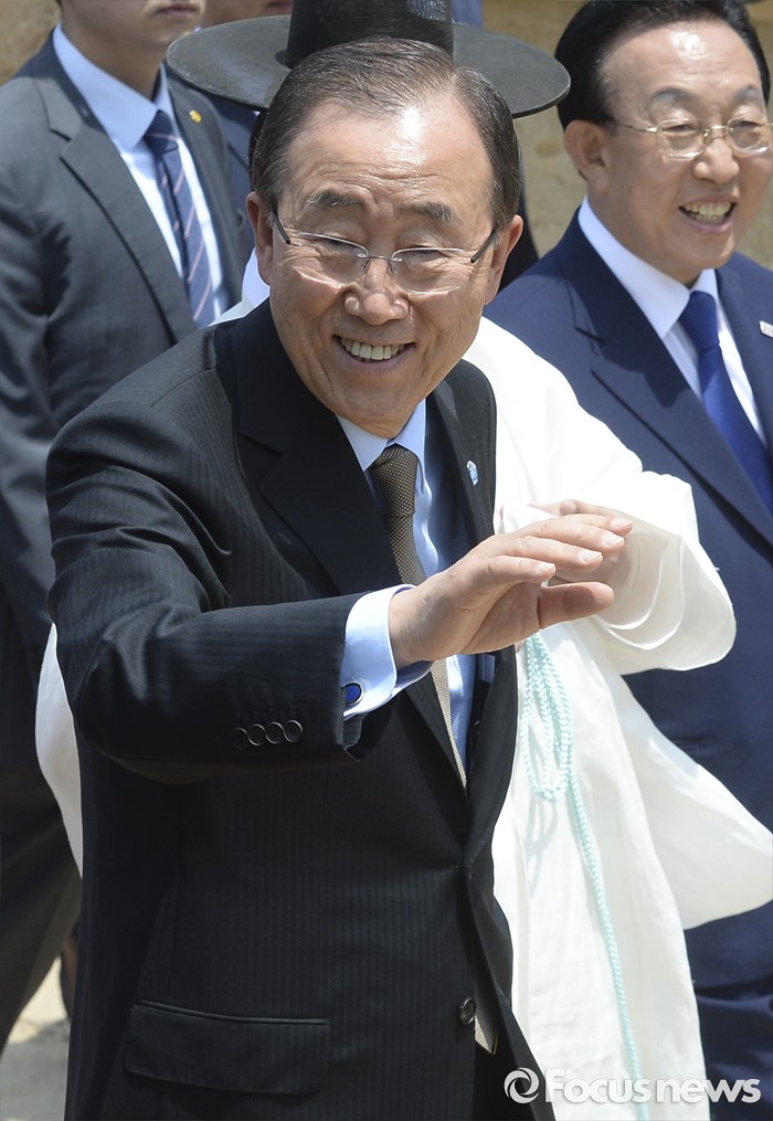 (안동=포커스뉴스) 29일 오후 경북 안동 하회마을을 방문한 반기문 유엔 사무총장이 식수를 위해 이동하며 시민들을 향해 손을 흔들고 있다.