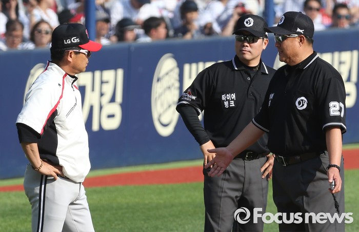(서울=포커스뉴스) 29일 서울 잠실구장에서 열린 2016프로야구 LG-두산 경기 6회말 LG 양상문 감독이 두산 박건우의 타구가 파울 아니냐며 항의하고 있다.