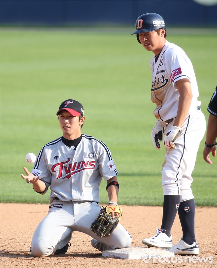 (서울=포커스뉴스) 29일 서울 잠실구장에서 열린 2016프로야구 LG-두산 경기 8회말 두산 1루주자 정수빈이 2루 도루에 성공하고 있다. 정수빈은 8년 연속 10도루를 성공했다.