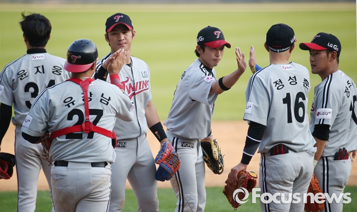 (서울=포커스뉴스) 29일 서울 잠실구장에서 열린 2016프로야구 LG-두산 경기에서 두산을 물리치고 4연패에서 탈출하며 승률 5할에 복귀한 LG 선수들이 마운드에 모여 하이파이브하며 승리의 기쁨을 함께하고 있다.