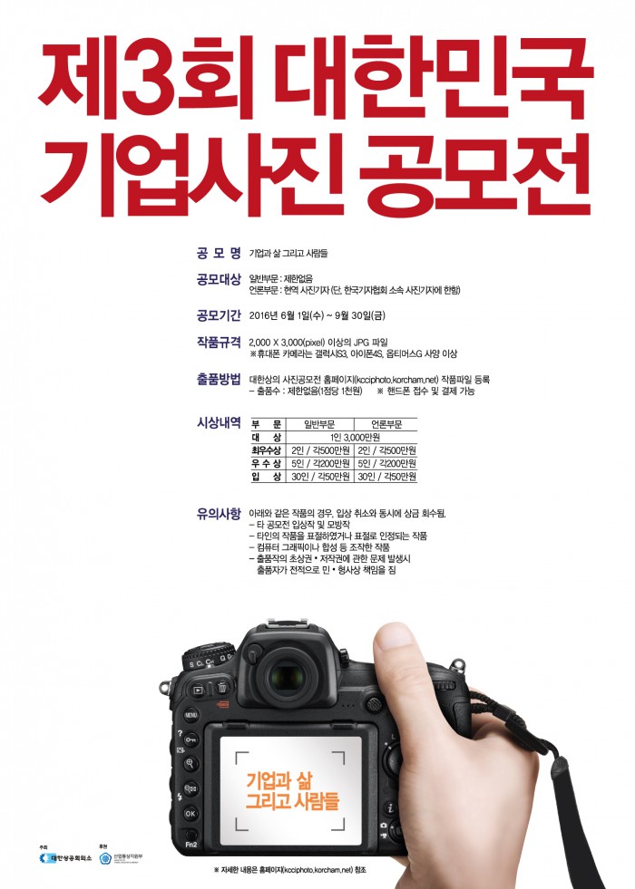 작품응모는 6월1일부터 9월30일까지 사진공모전 사이트(kcciphoto.korcham.net)에서 온라인 또는 모바일을 통해 등록할 수 있다. 온라인은 물론 핸드폰에서도 사진을 바로 접수하고 결제할 수 있다