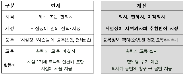또한, 촉탁의 지정은 지역의사회의 추천을 통하는 방식으로 개선한다. 그간에는 촉탁의를 시설장이 선택해 지정했으나, 앞으로는 시설장이 각 직역(의사협회, 한의사협회, 치과의사협회)별 지역의사회에 추천을 요청해 지정한다.