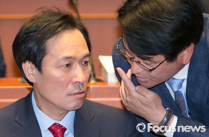 (서울=포커스뉴스) 20대 국회 임기가 시작된 30일 오전 서울 여의도 국회에서 열린 더불어민주당 의원총회에 참석한 우상호(왼쪽) 원내대표와 박용진 대표비서실장이 대화하고 있다.