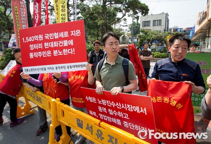 (서울=포커스뉴스) 30일 오전 서울 동작구청에서 노량진수산시장 상인생계대책위원회 관계자들이 박원순 서울시장과의 면담을 요구하며 기다리고 있다.