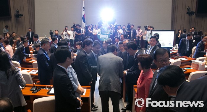 (서울=포커스뉴스) 20대 국회 임기가 시작된 30일 오전 서울 여의도 국회에서 열린 더불어민주당 의원총회에 참석한 의원들이 서로 인사하고 있다.