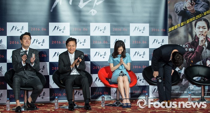 (서울=포커스뉴스) 30일 오전 서울 광진구 건대입구 롯데시네마에서 열린 영화 '사냥' 제작보고회에 참석한 배우 손현주(오른쪽)가 인사를 하고 있다. 왼쪽부터 배우 조진웅, 안성기, 한예리, 손현주.