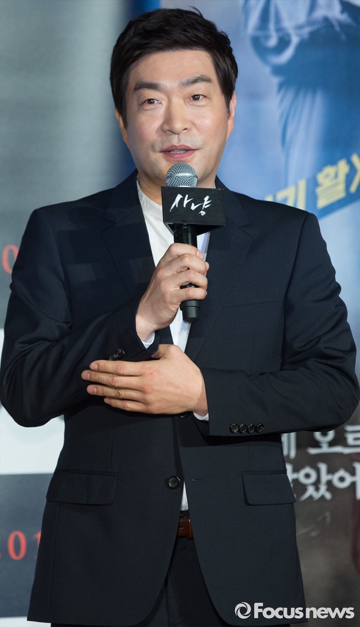 (서울=포커스뉴스) 30일 오전 서울 광진구 건대입구 롯데시네마에서 열린 영화 '사냥' 제작보고회에 참석한 배우 손현주가 인사말을 하고 있다.