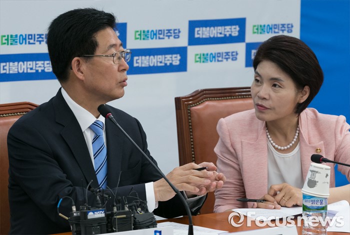 (서울=포커스뉴스) 30일 오전 서울 여의도 국회에서 열린 더불어민주당 가습기살균제대책특위 5차 회의, 가습기 살균제 피해 문제 해결을 위한 전문가 간담회에 참석한 양승조(왼쪽) 위원장과 한정애 의원이 대화하고 있다.